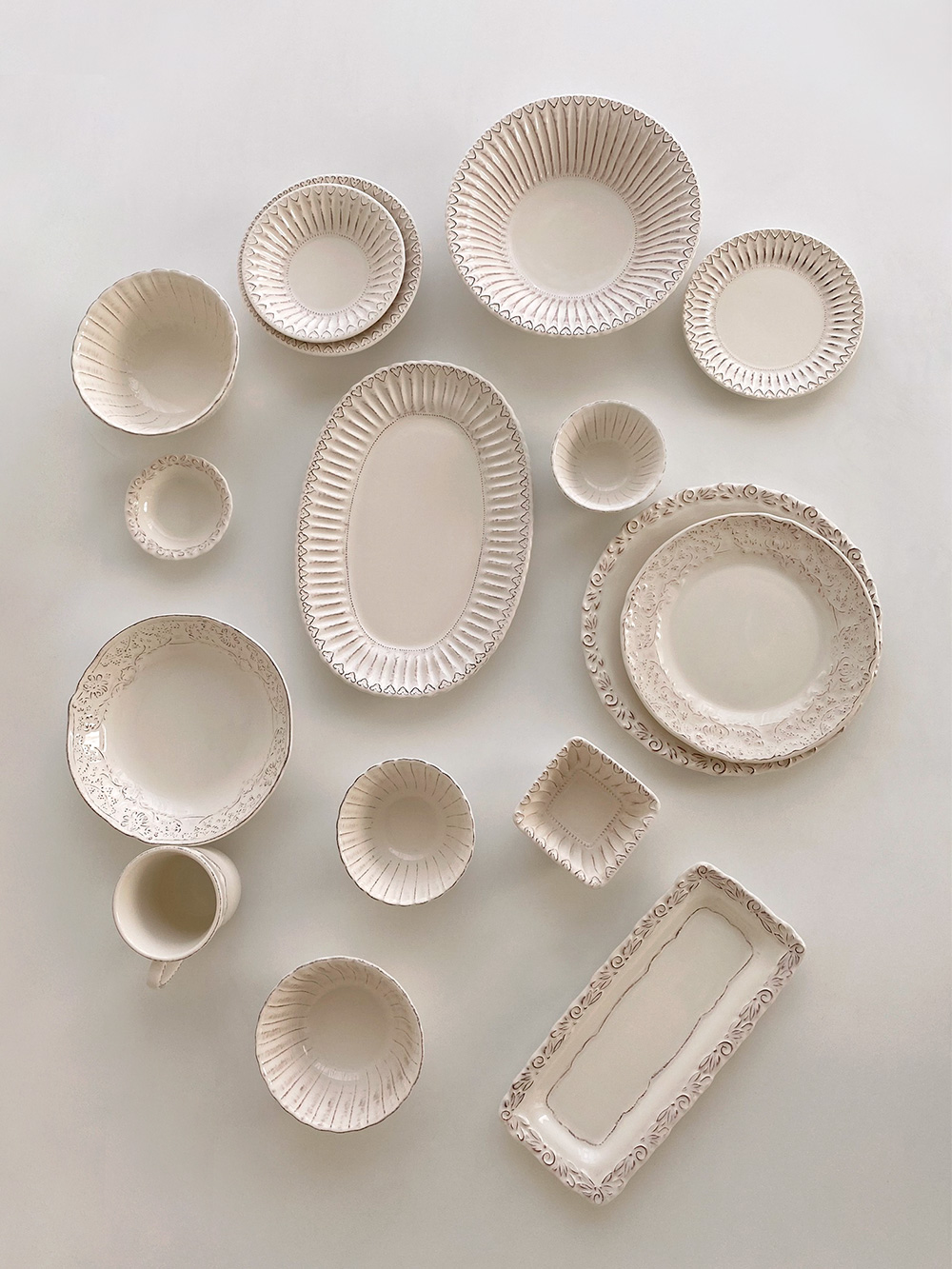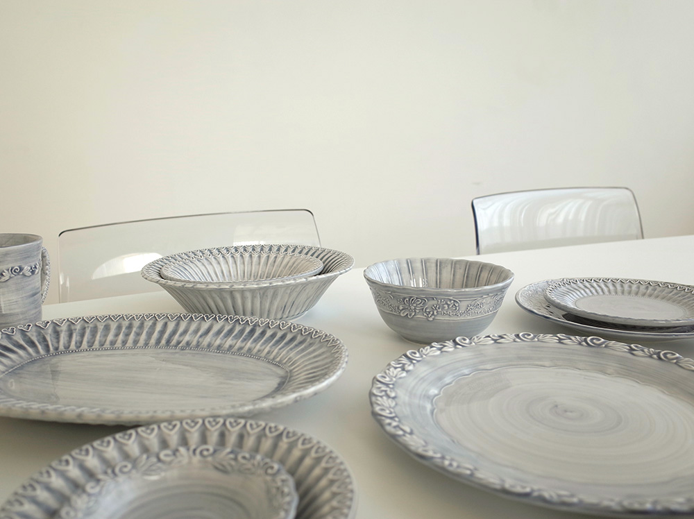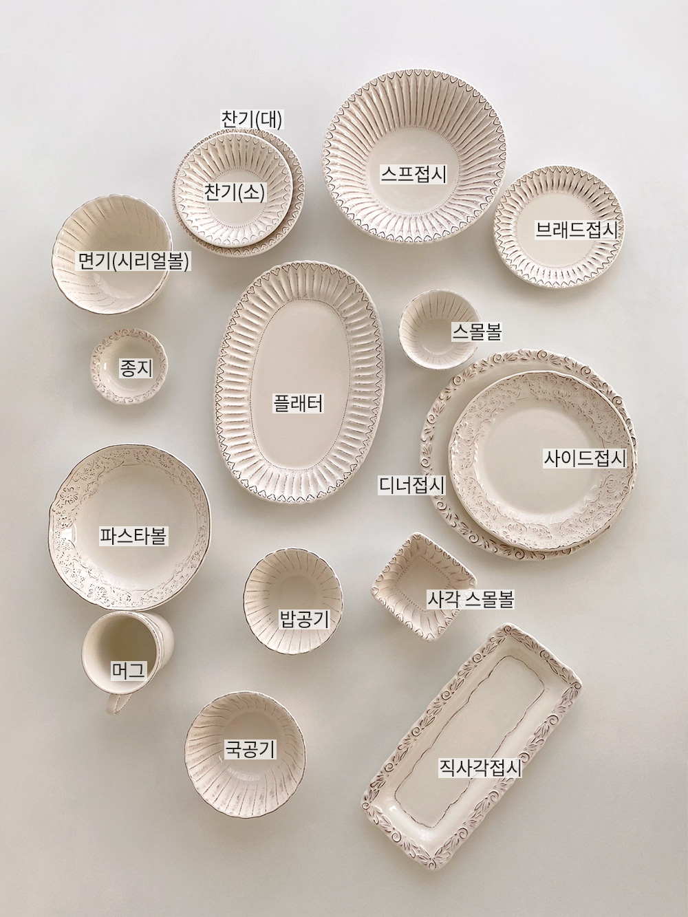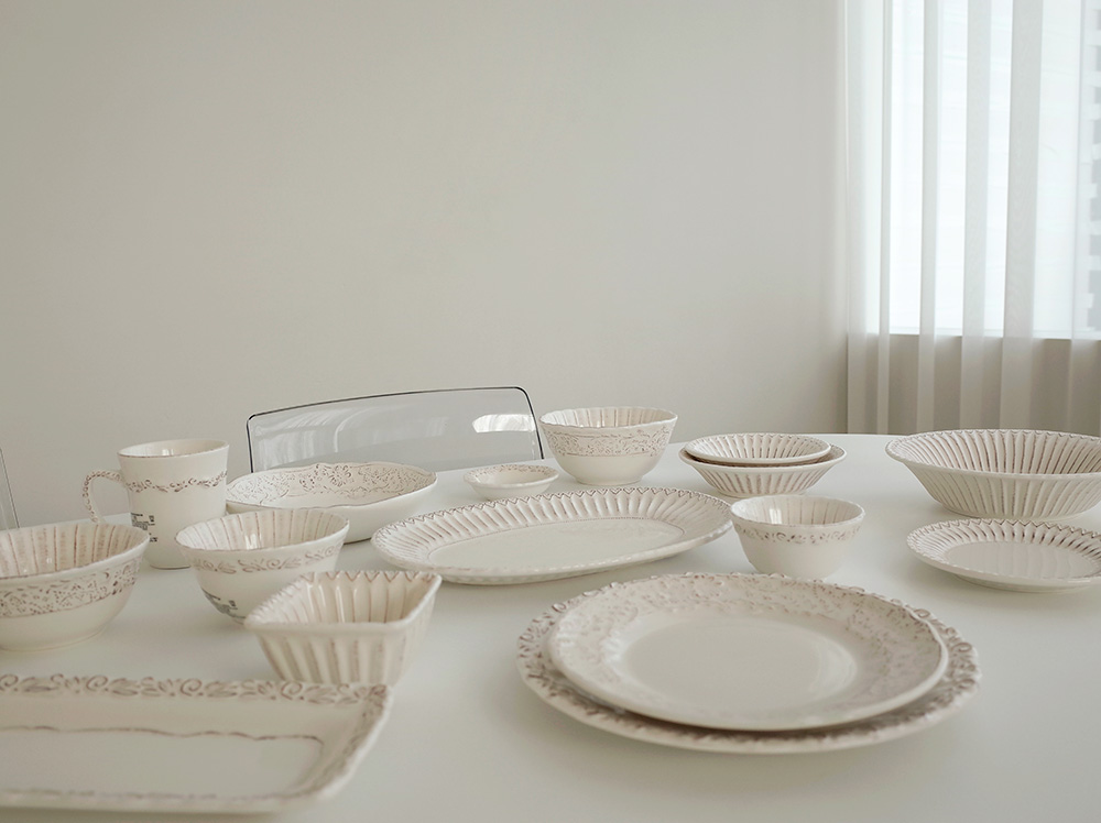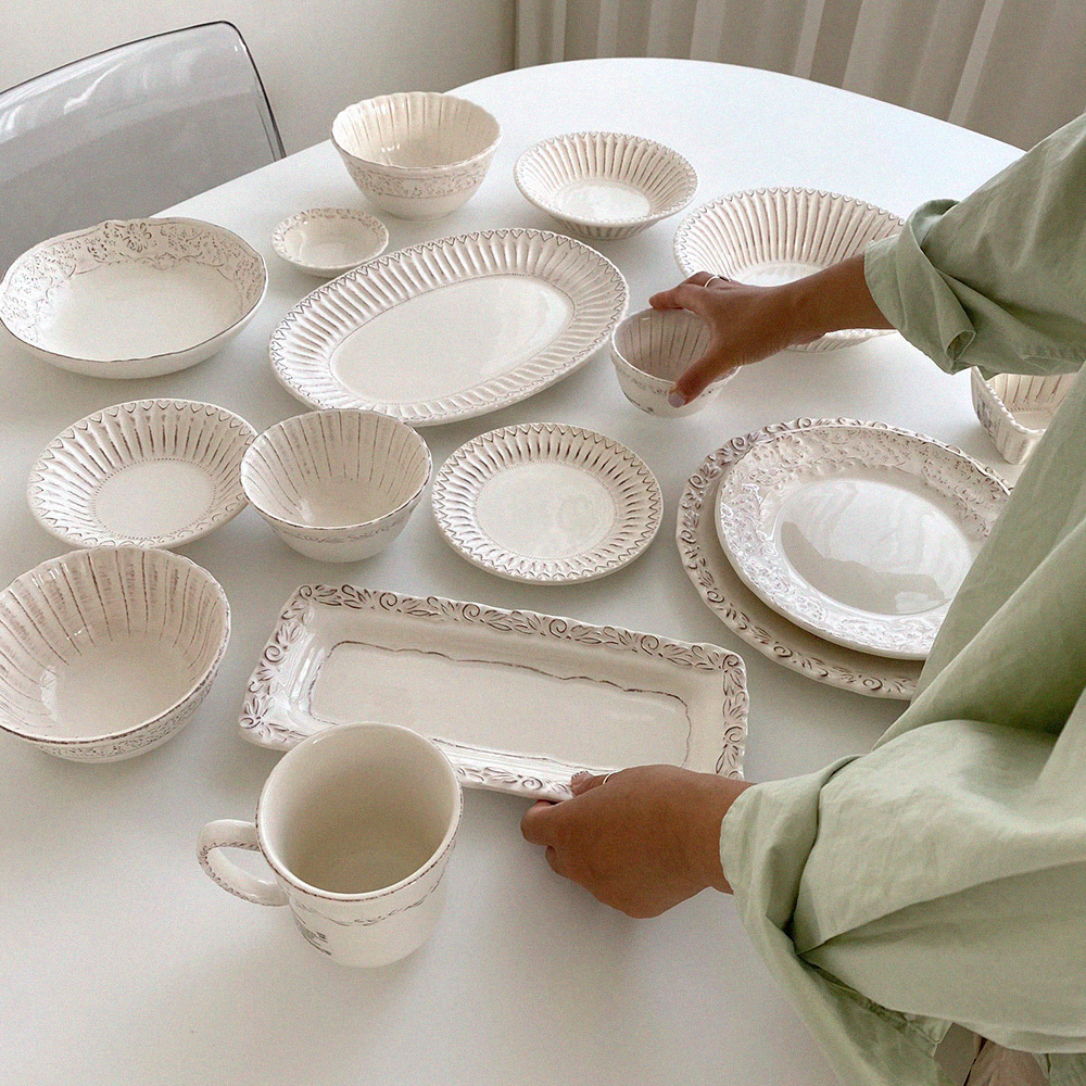 포르투갈 핸드메이드 도자기, 메세라미카 티에라 줄리엣 시리즈 입니다. 하나하나 들여다볼수록 디테일이 돋보이는 그릇들이죠. 중세 유럽의 클래식함과 현대적인 간결함이 공존하는 디자인입니다. 은은한 컬러감으로 단독으로 추가하셔도 보유하고 계신 키친 웨어들과 어렵지 않게 어우러진답니다. 우아한 카라꽃에서 모티브를 얻어 디자인된 티에라 시리즈는 가장자리를 따라 양각과 음각으로 섬세하게 새겨넣은 패턴이 더욱 고급스러운 테이블을 연출해줍니다. 한식 차림도 어렵지 않도록 구성되어 있습니다.
