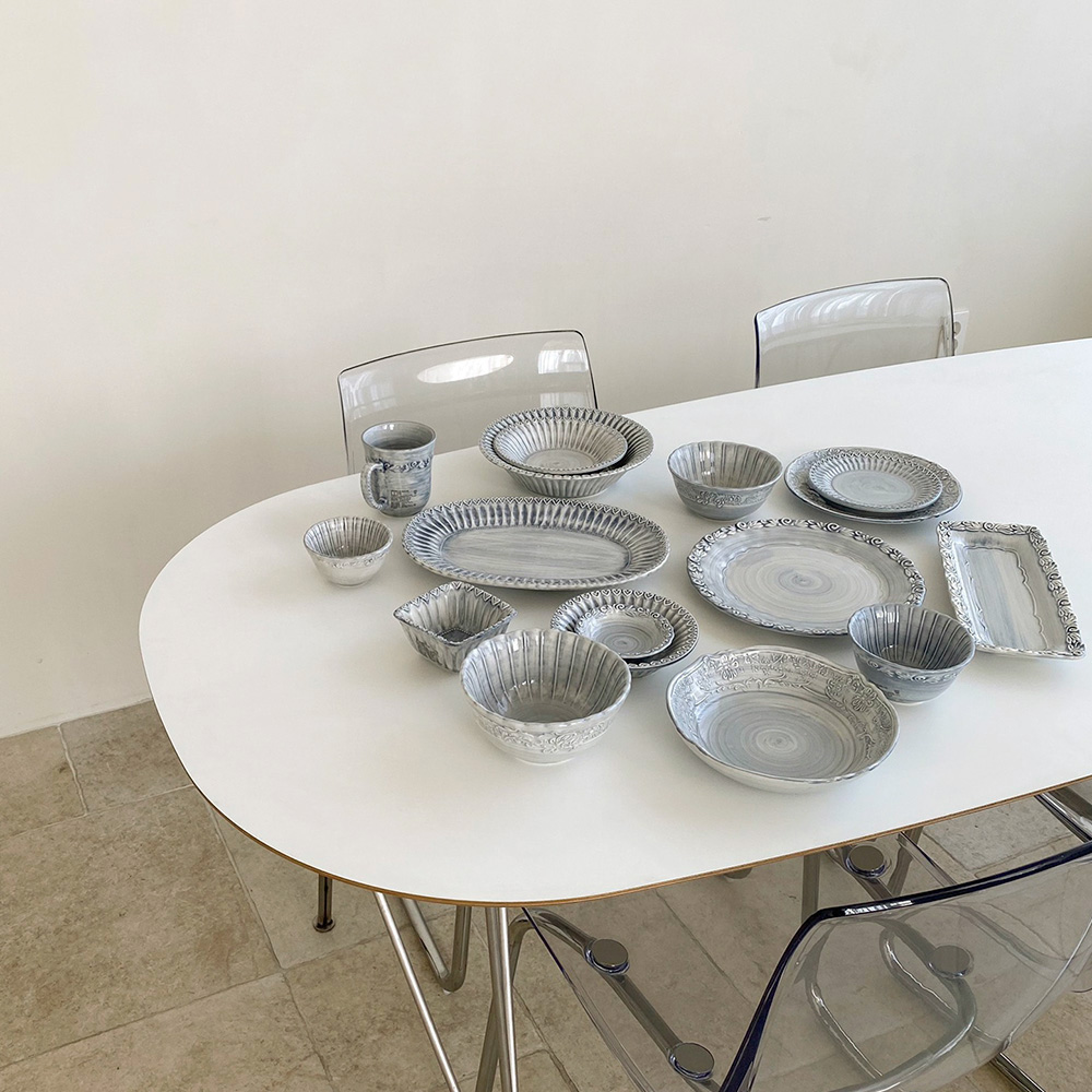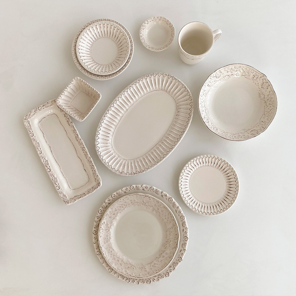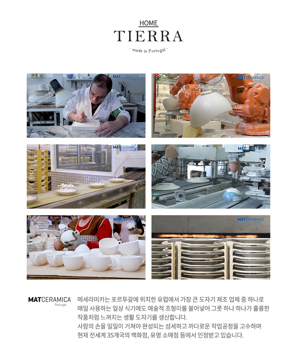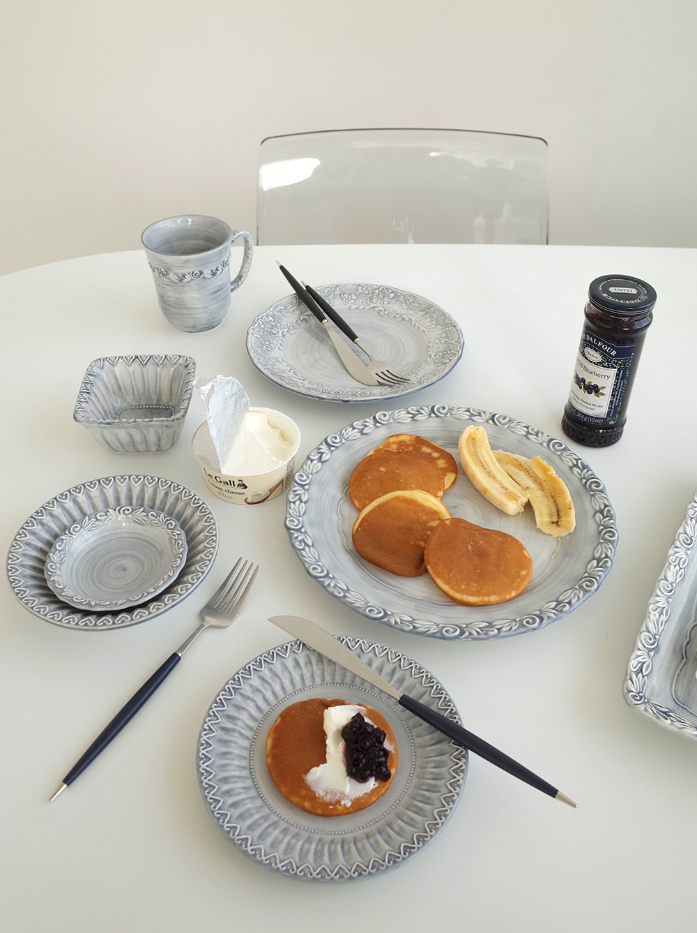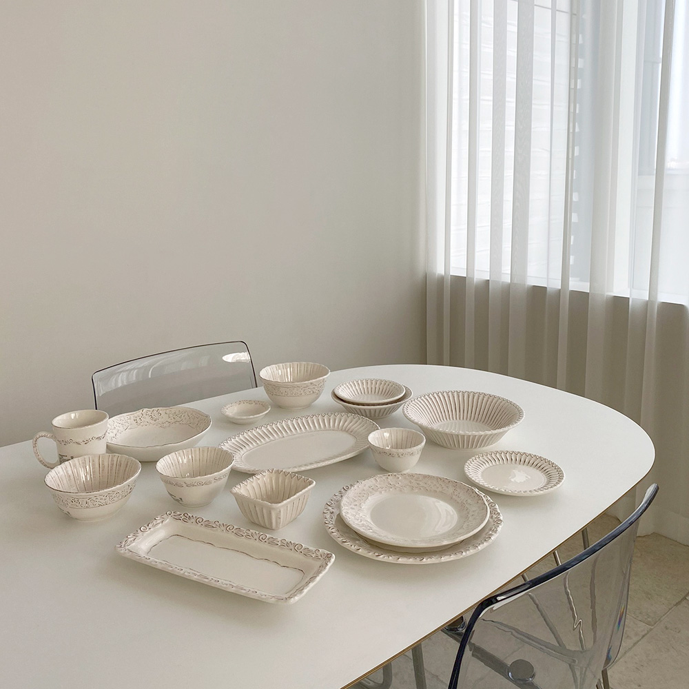 포르투갈 핸드메이드 도자기, 메세라미카 티에라 줄리엣 시리즈 입니다. 하나하나 들여다볼수록 디테일이 돋보이는 그릇들이죠. 중세 유럽의 클래식함과 현대적인 간결함이 공존하는 디자인입니다. 은은한 컬러감으로 단독으로 추가하셔도 보유하고 계신 키친 웨어들과 어렵지 않게 어우러진답니다. 우아한 카라꽃에서 모티브를 얻어 디자인된 티에라 시리즈는 가장자리를 따라 양각과 음각으로 섬세하게 새겨넣은 패턴이 더욱 고급스러운 테이블을 연출해줍니다. 한식 차림도 어렵지 않도록 구성되어 있습니다.