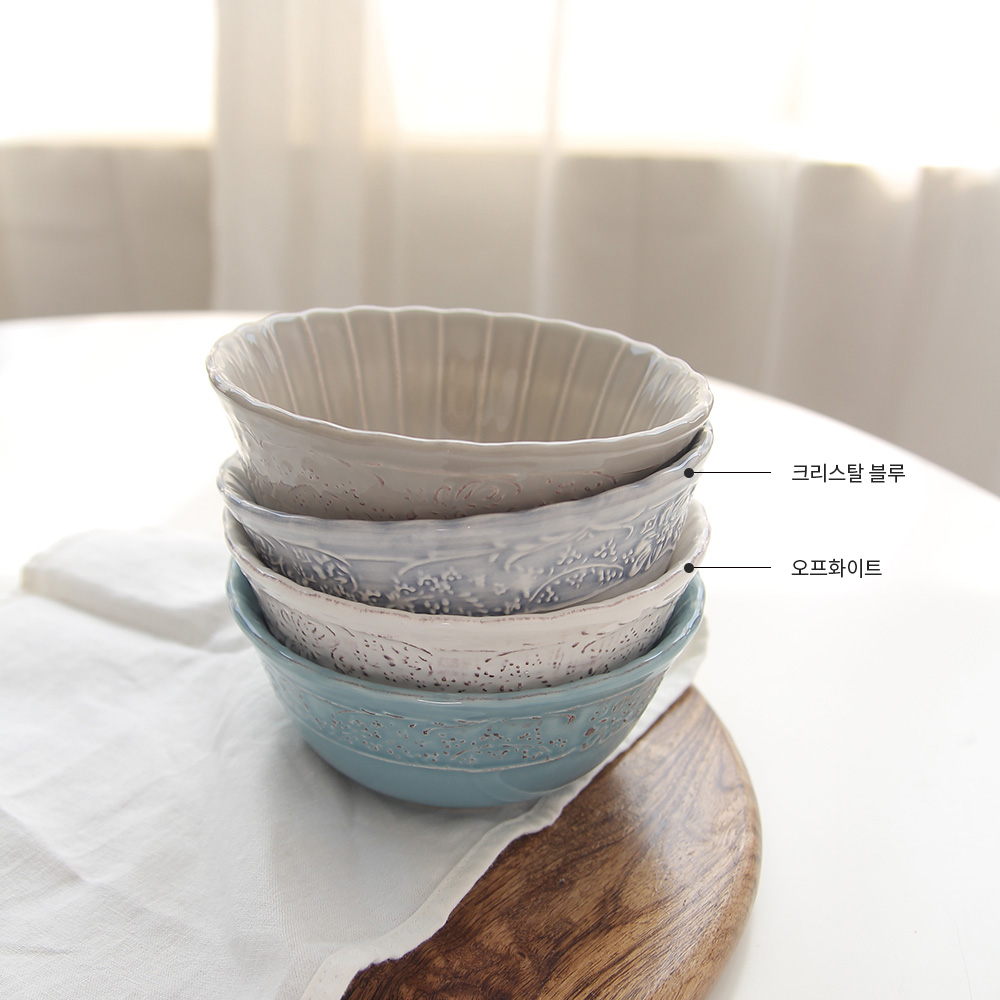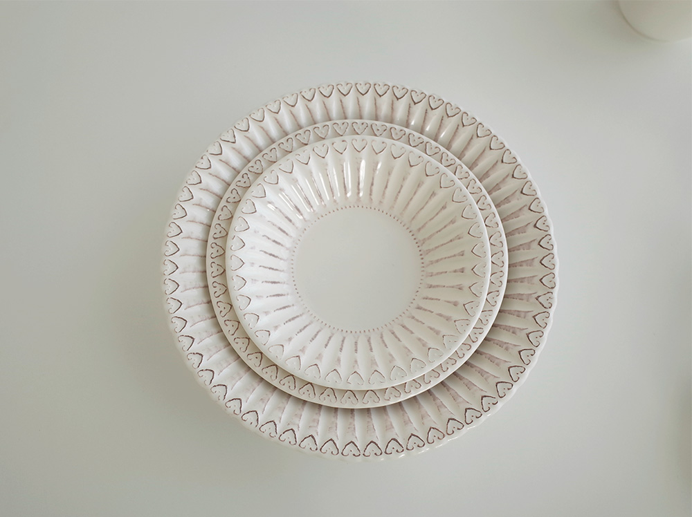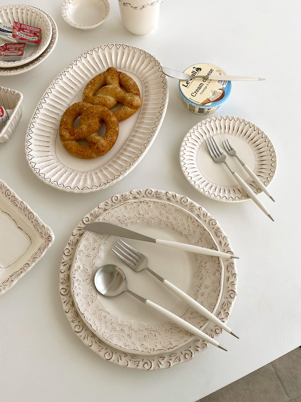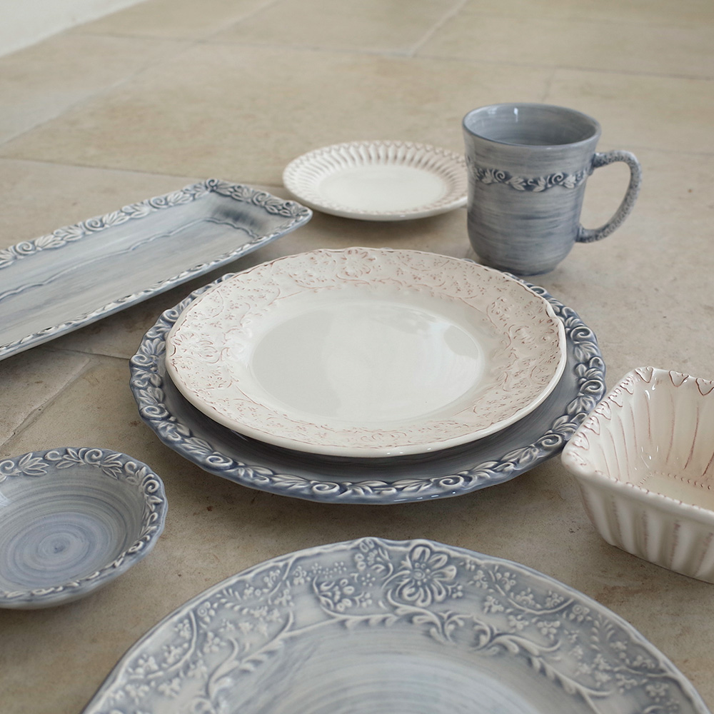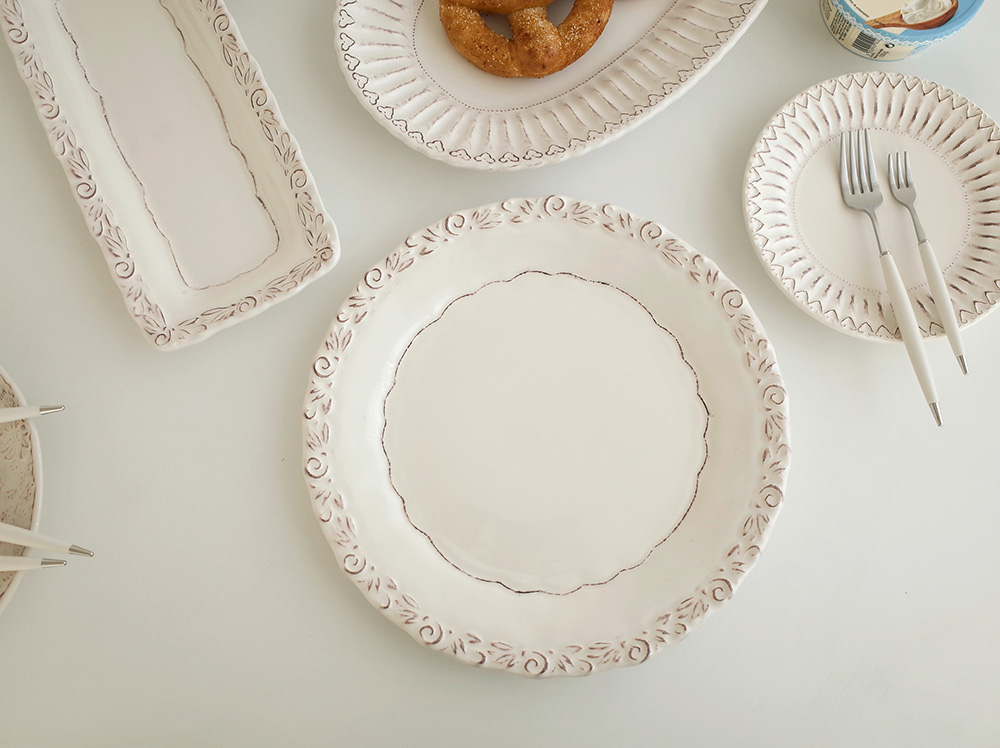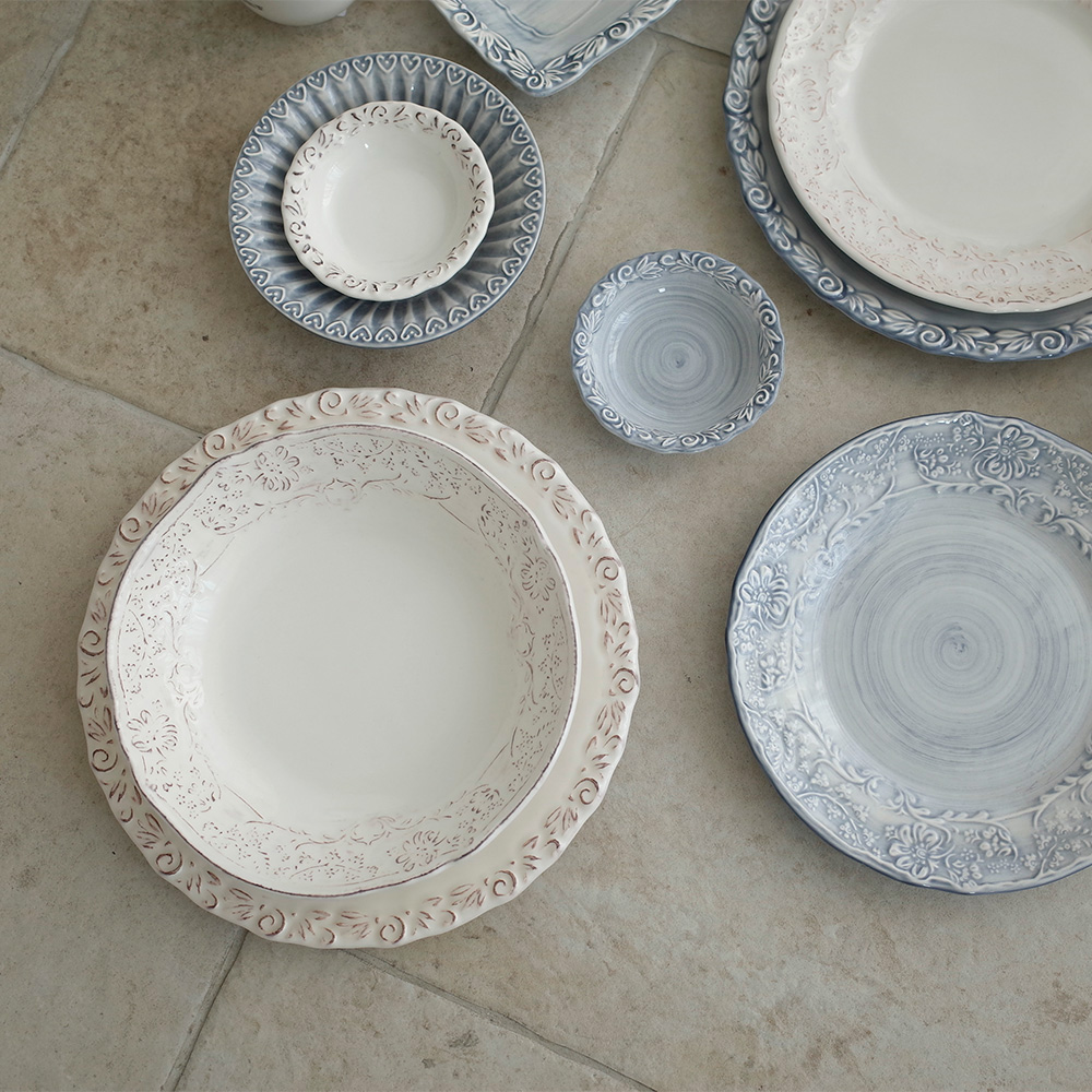 포르투갈 핸드메이드 도자기, 메세라미카 티에라 줄리엣 시리즈 입니다. 하나하나 들여다볼수록 디테일이 돋보이는 그릇들이죠. 중세 유럽의 클래식함과 현대적인 간결함이 공존하는 디자인입니다. 은은한 컬러감으로 단독으로 추가하셔도 보유하고 계신 키친 웨어들과 어렵지 않게 어우러진답니다. 우아한 카라꽃에서 모티브를 얻어 디자인된 티에라 시리즈는 가장자리를 따라 양각과 음각으로 섬세하게 새겨넣은 패턴이 더욱 고급스러운 테이블을 연출해줍니다. 한식 차림도 어렵지 않도록 구성되어 있습니다.
