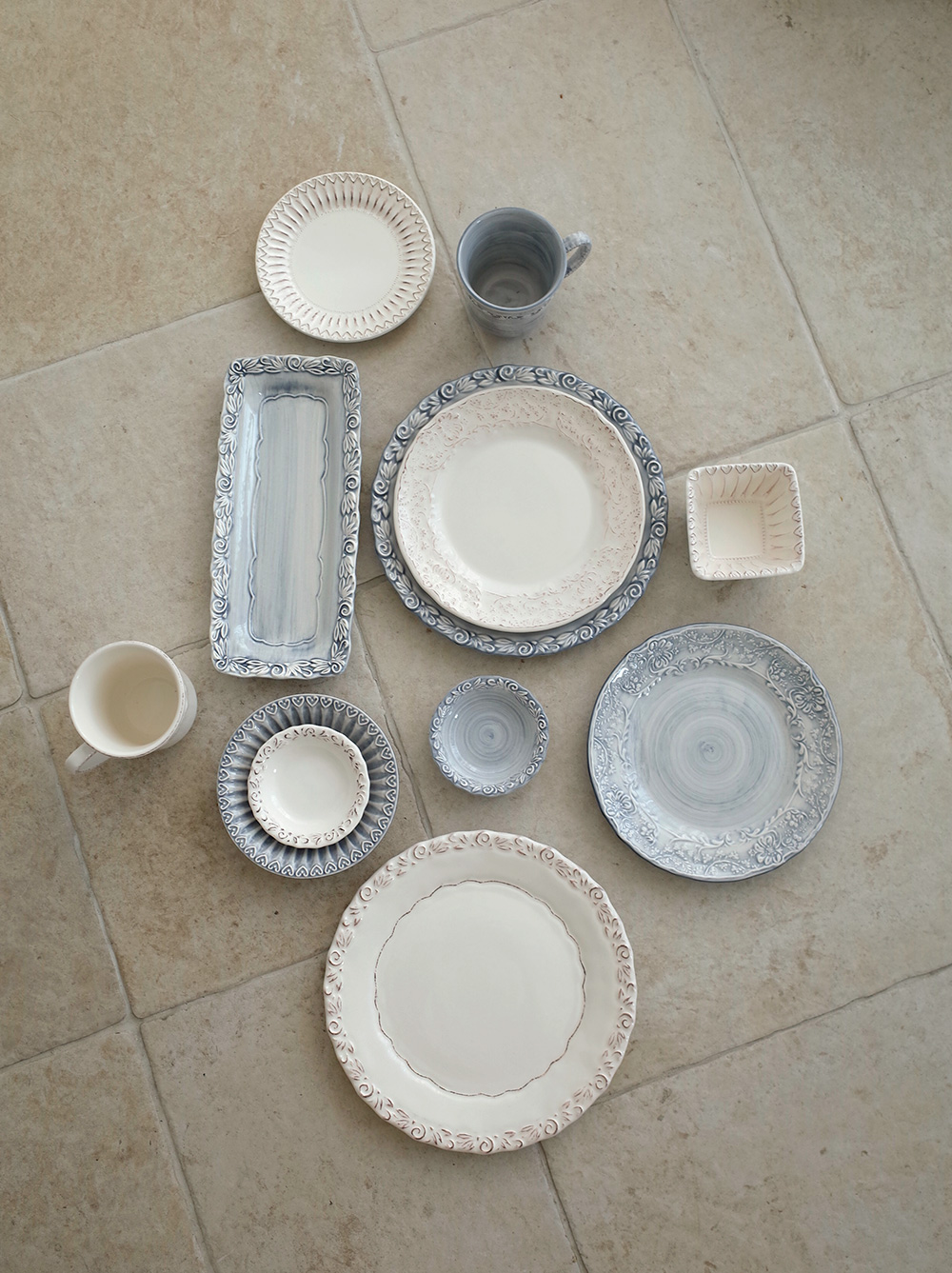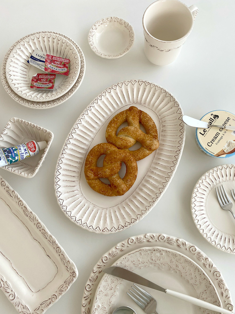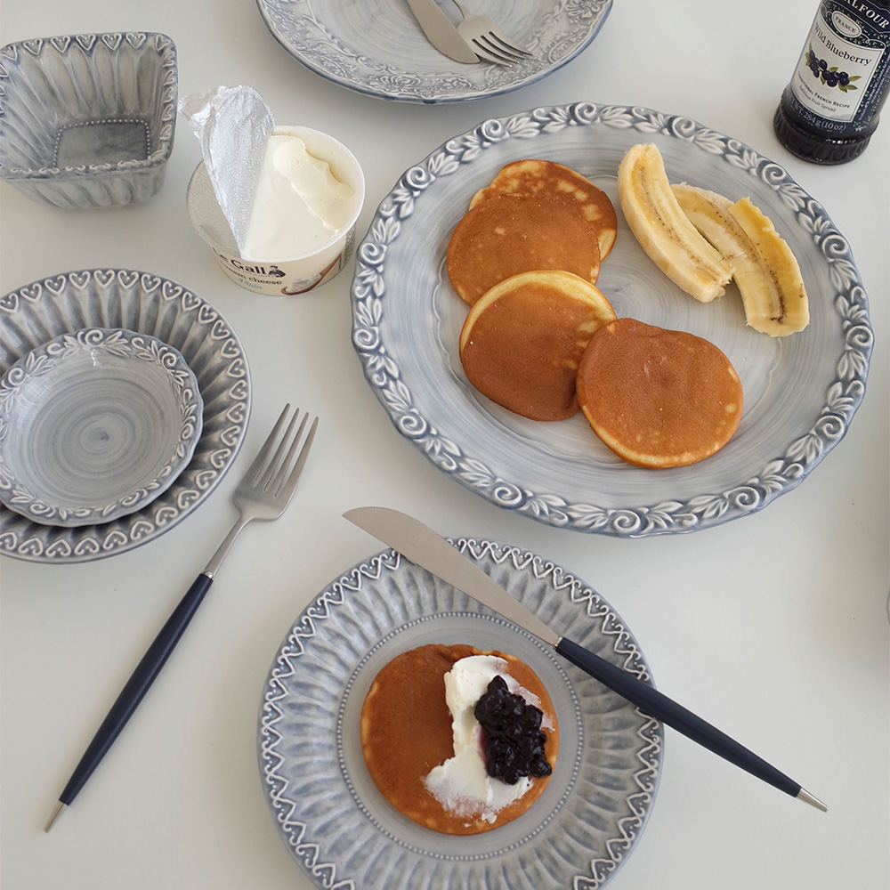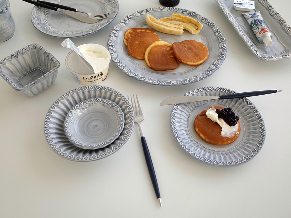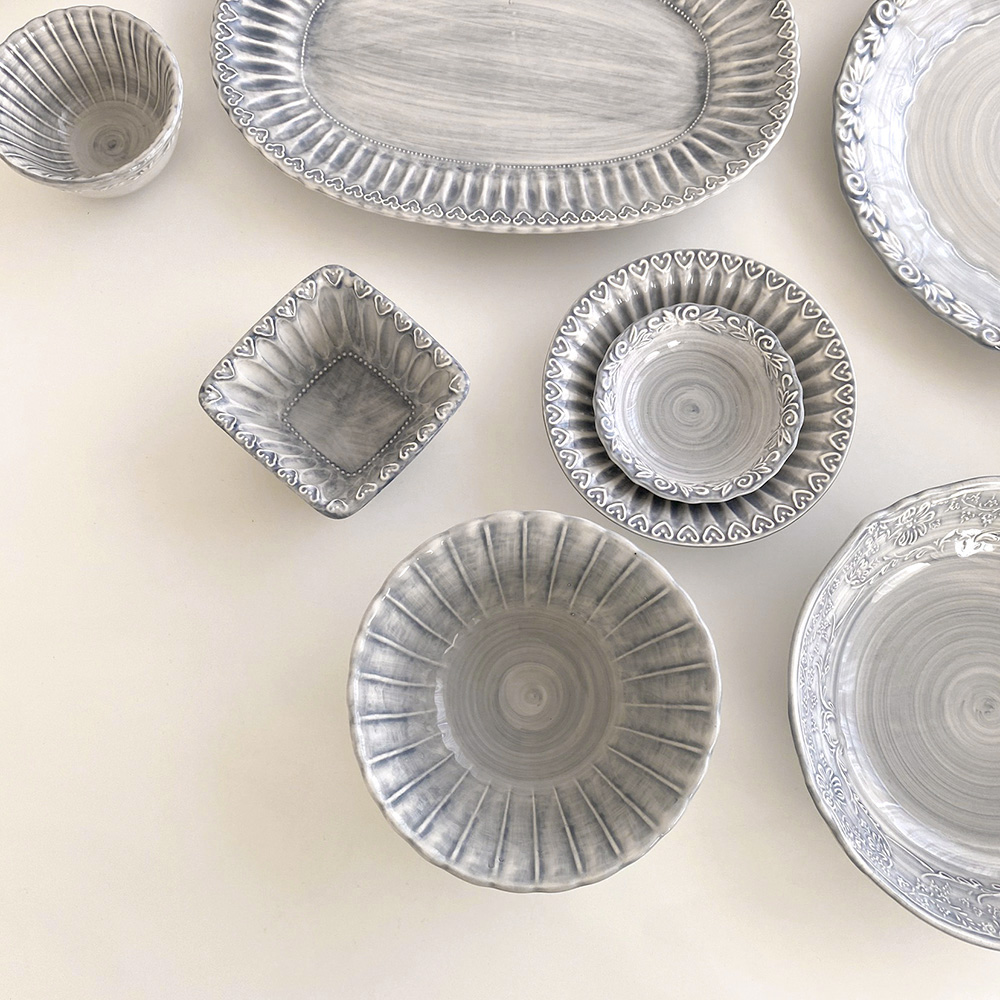 포르투갈 핸드메이드 도자기, 메세라미카 티에라 줄리엣 시리즈 입니다. 하나하나 들여다볼수록 디테일이 돋보이는 그릇들이죠. 중세 유럽의 클래식함과 현대적인 간결함이 공존하는 디자인입니다. 은은한 컬러감으로 단독으로 추가하셔도 보유하고 계신 키친 웨어들과 어렵지 않게 어우러진답니다. 우아한 카라꽃에서 모티브를 얻어 디자인된 티에라 시리즈는 가장자리를 따라 양각과 음각으로 섬세하게 새겨넣은 패턴이 더욱 고급스러운 테이블을 연출해줍니다. 한식 차림도 어렵지 않도록 구성되어 있습니다.