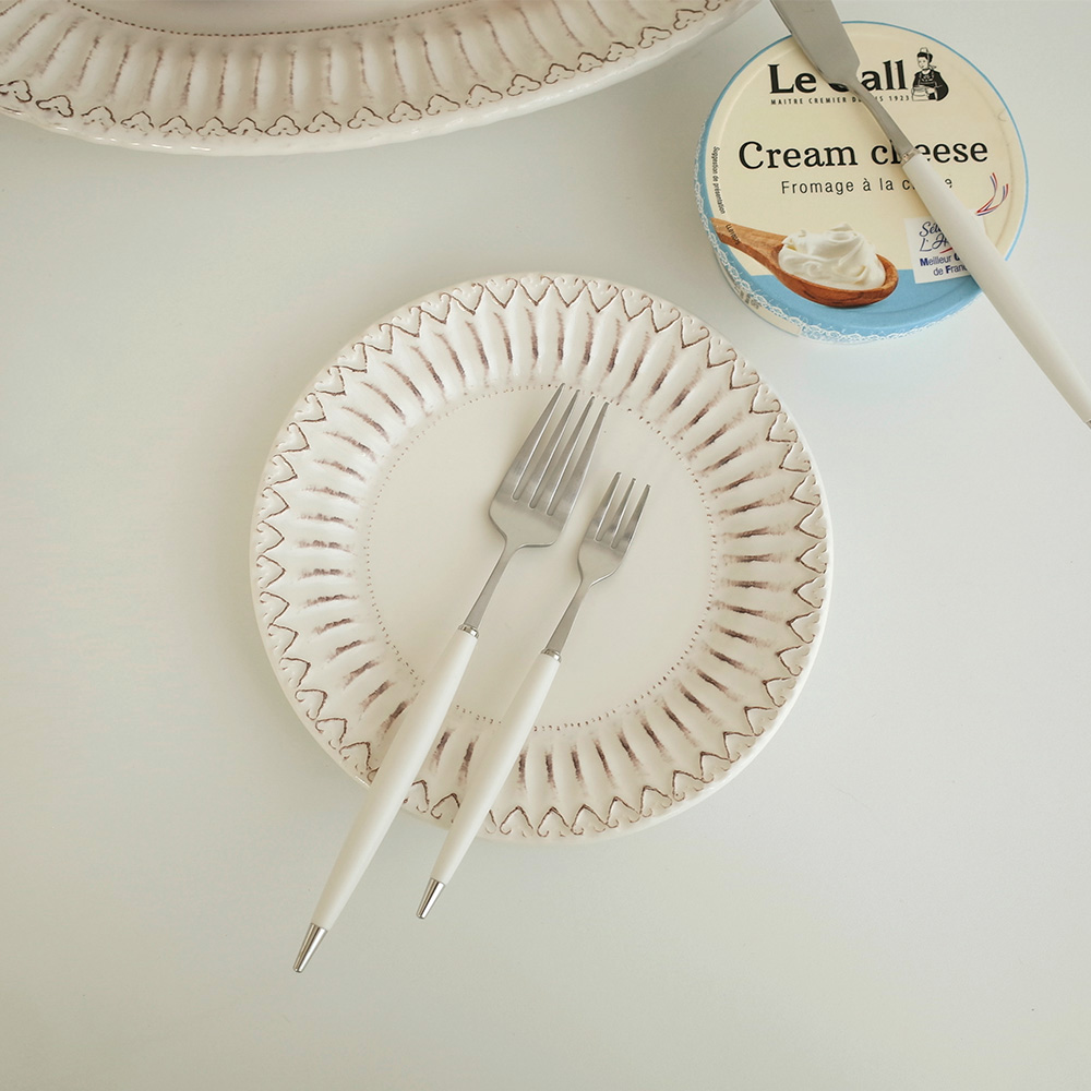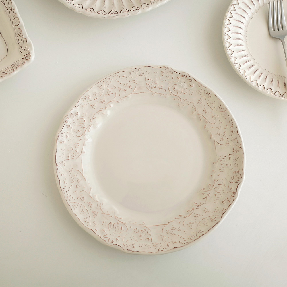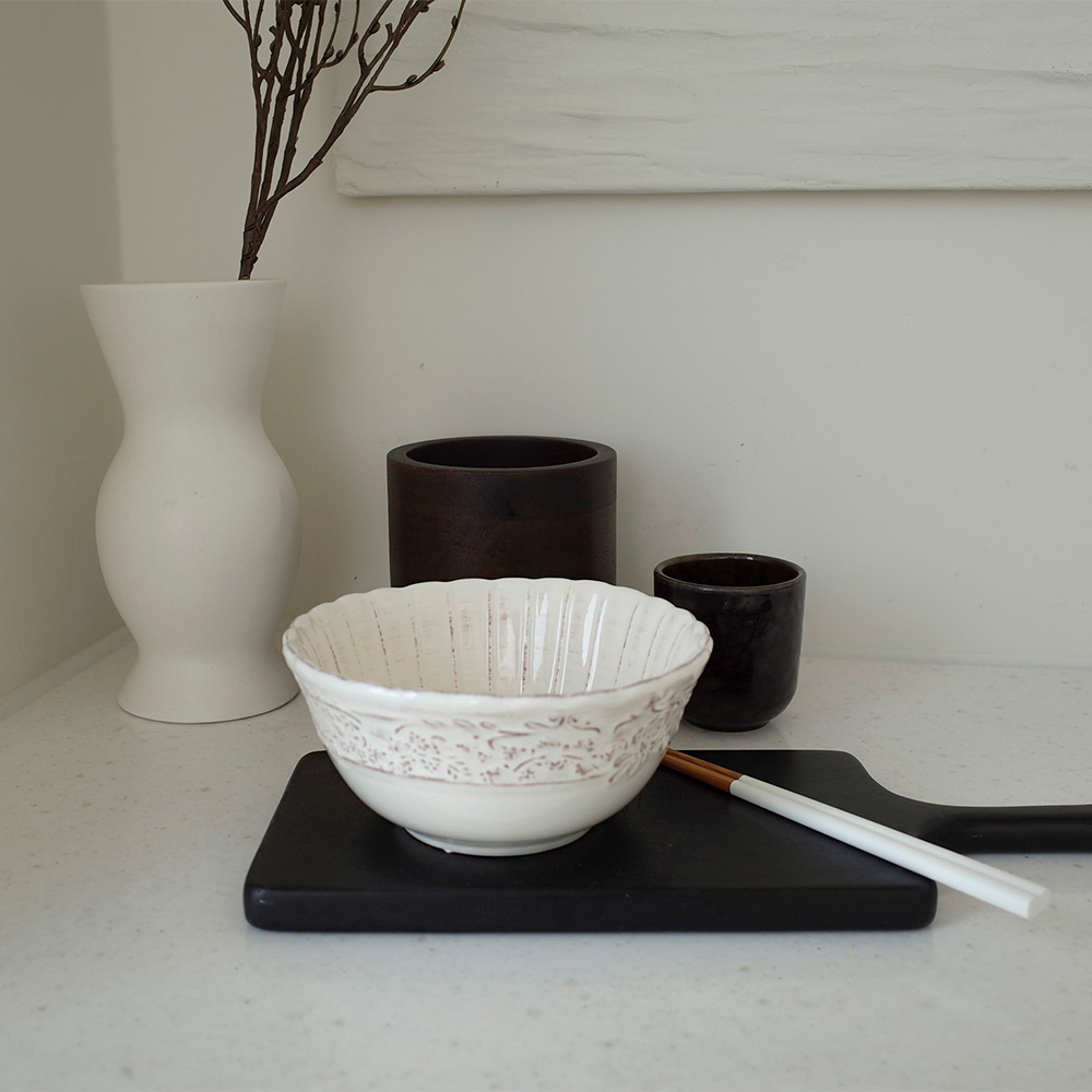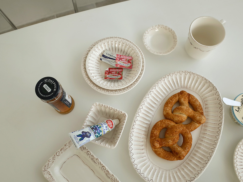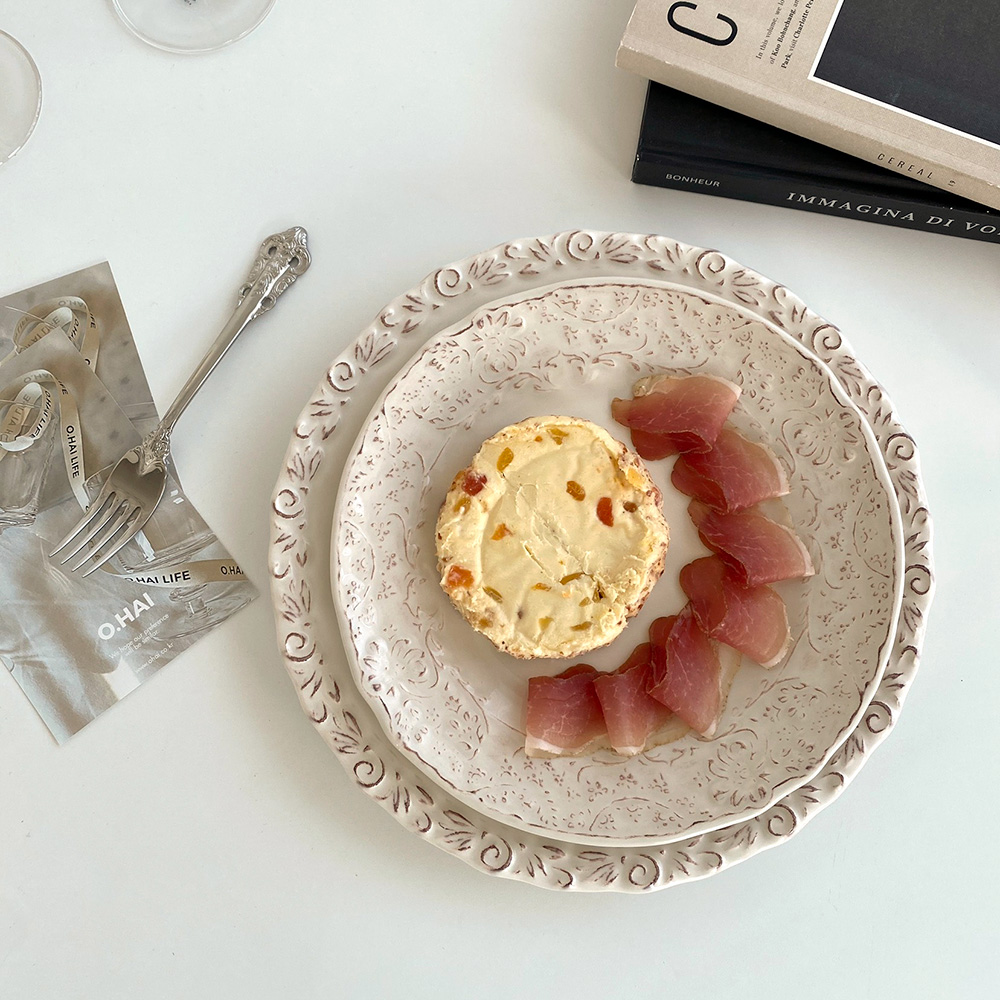 포르투갈 핸드메이드 도자기, 메세라미카 티에라 줄리엣 시리즈 입니다. 하나하나 들여다볼수록 디테일이 돋보이는 그릇들이죠. 중세 유럽의 클래식함과 현대적인 간결함이 공존하는 디자인입니다. 은은한 컬러감으로 단독으로 추가하셔도 보유하고 계신 키친 웨어들과 어렵지 않게 어우러진답니다. 우아한 카라꽃에서 모티브를 얻어 디자인된 티에라 시리즈는 가장자리를 따라 양각과 음각으로 섬세하게 새겨넣은 패턴이 더욱 고급스러운 테이블을 연출해줍니다. 한식 차림도 어렵지 않도록 구성되어 있습니다.