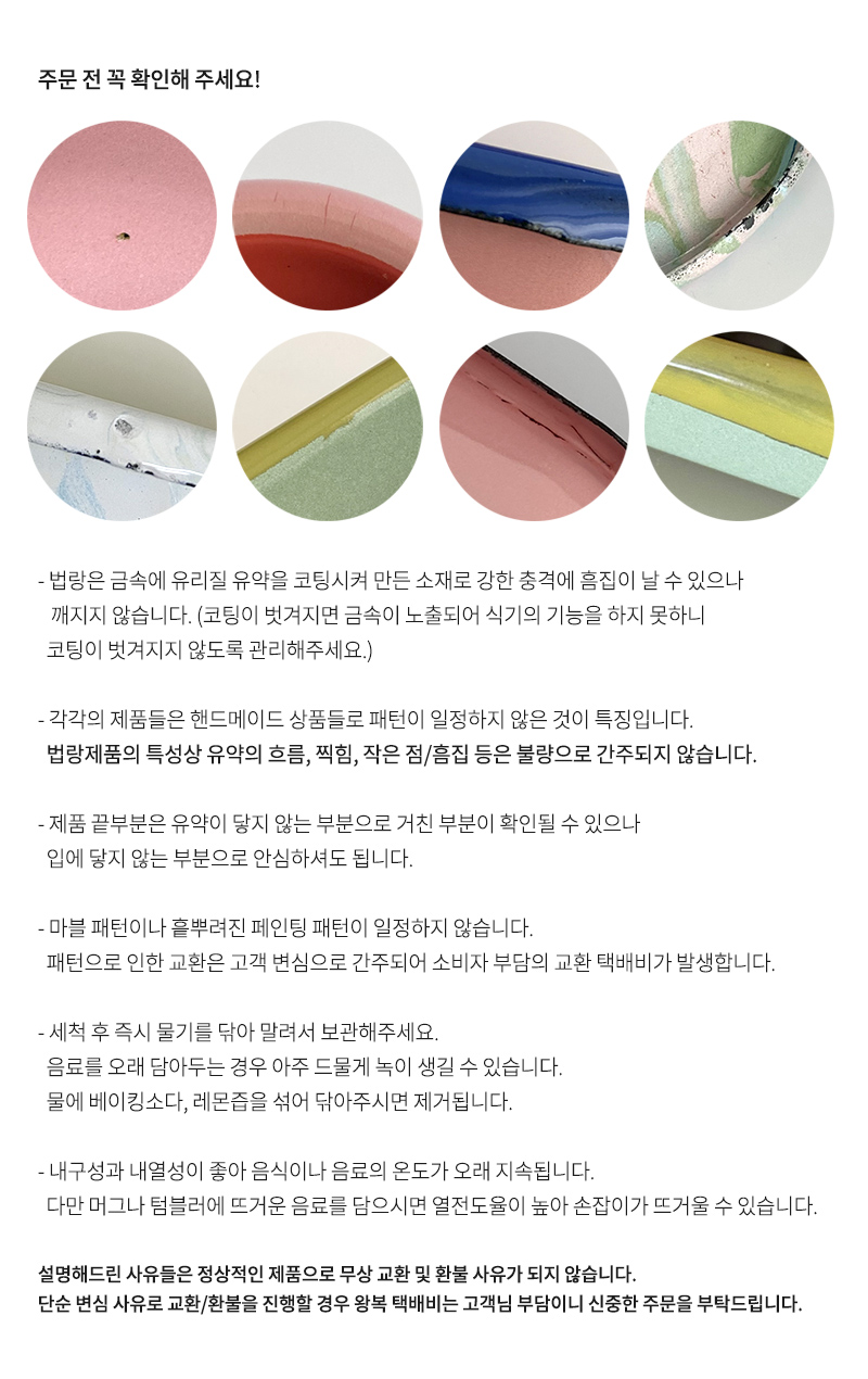 - 단순 변심에 의한 교환이나 반품은 고객님께서 왕복 택배비를 부담해주셔야 합니다.