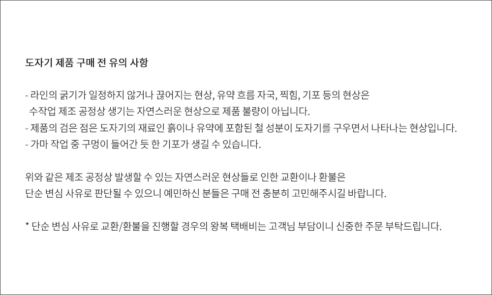 - 단순 변심에 의한 교환이나 반품은 고객님께서 왕복 택배비를 부담해주셔야 합니다.